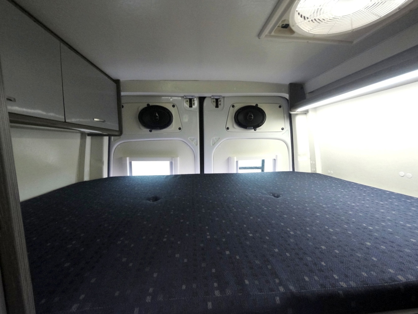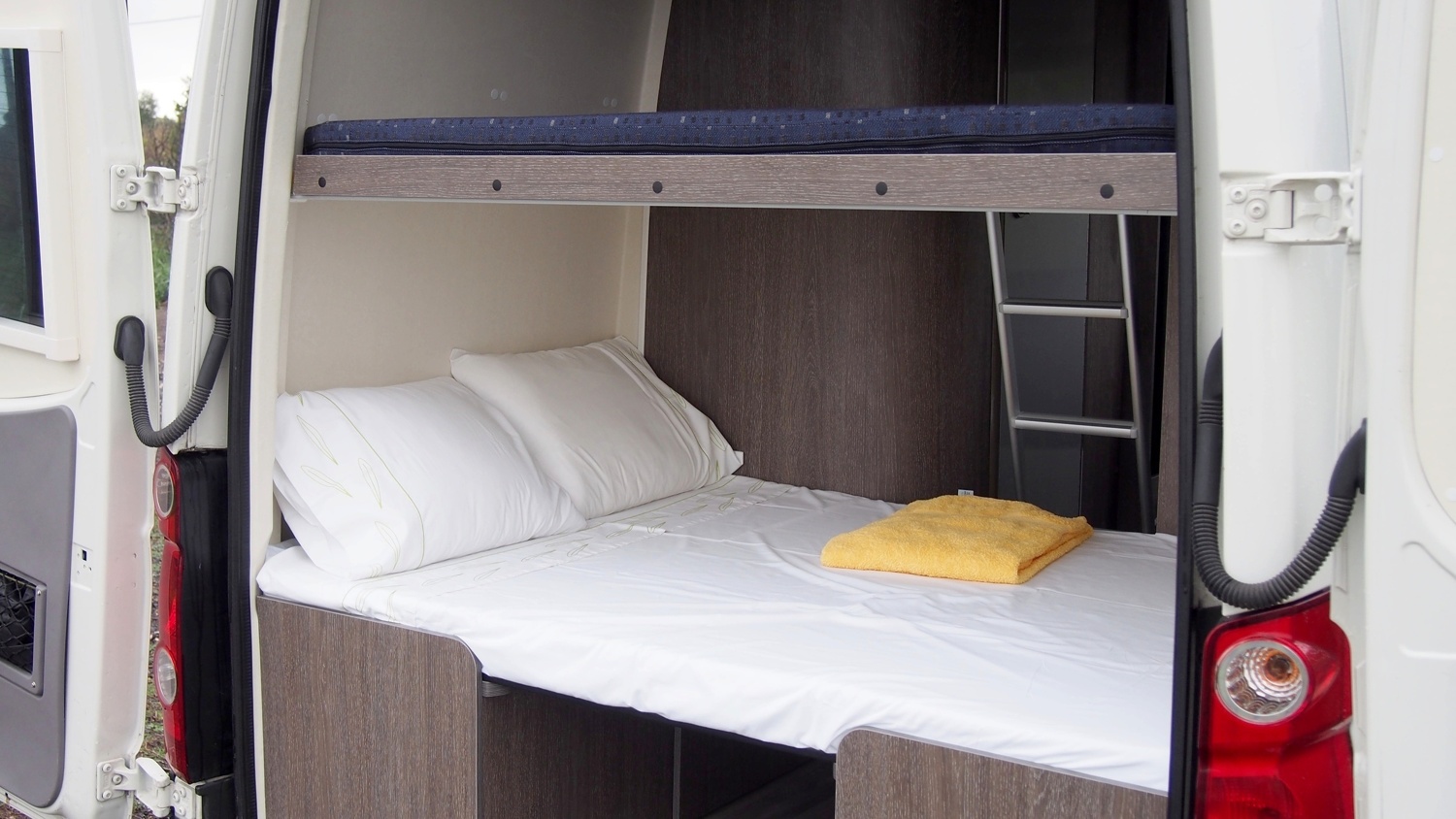 Situada en la parte trasera del vehículo de forma trasversal, ocupando toda la anchura del vehículo. Permite beneficiar de espacio en la zona habitable y de la comodidad de una gran cama doble.