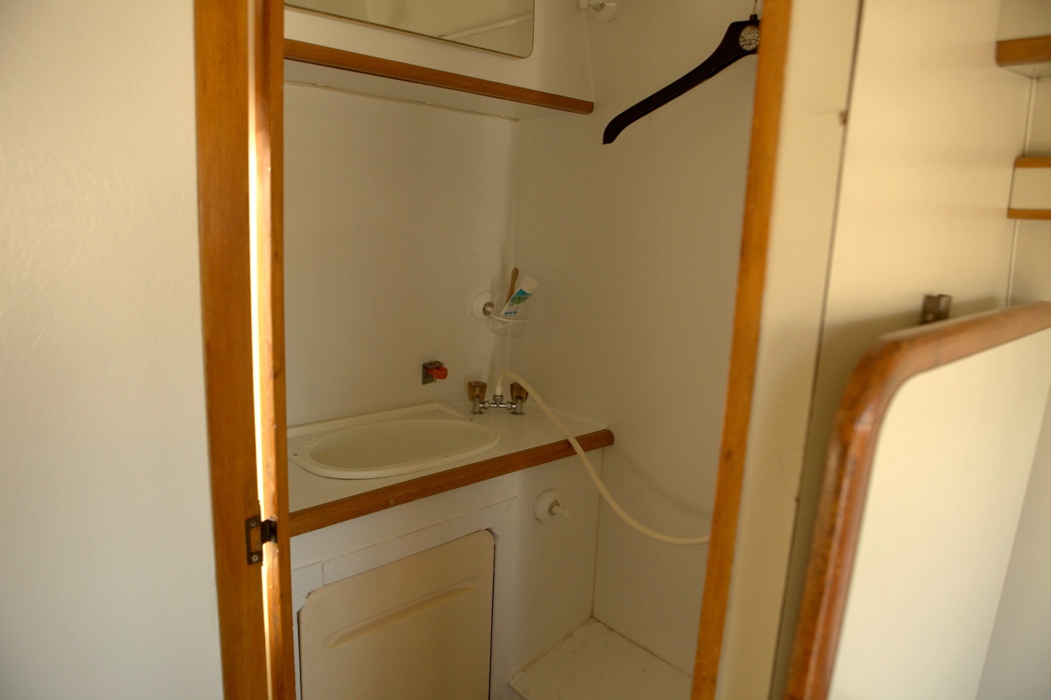 bathroom (portable toilet, interior shower plus outdoor solar showers, skylight that opens as a window);